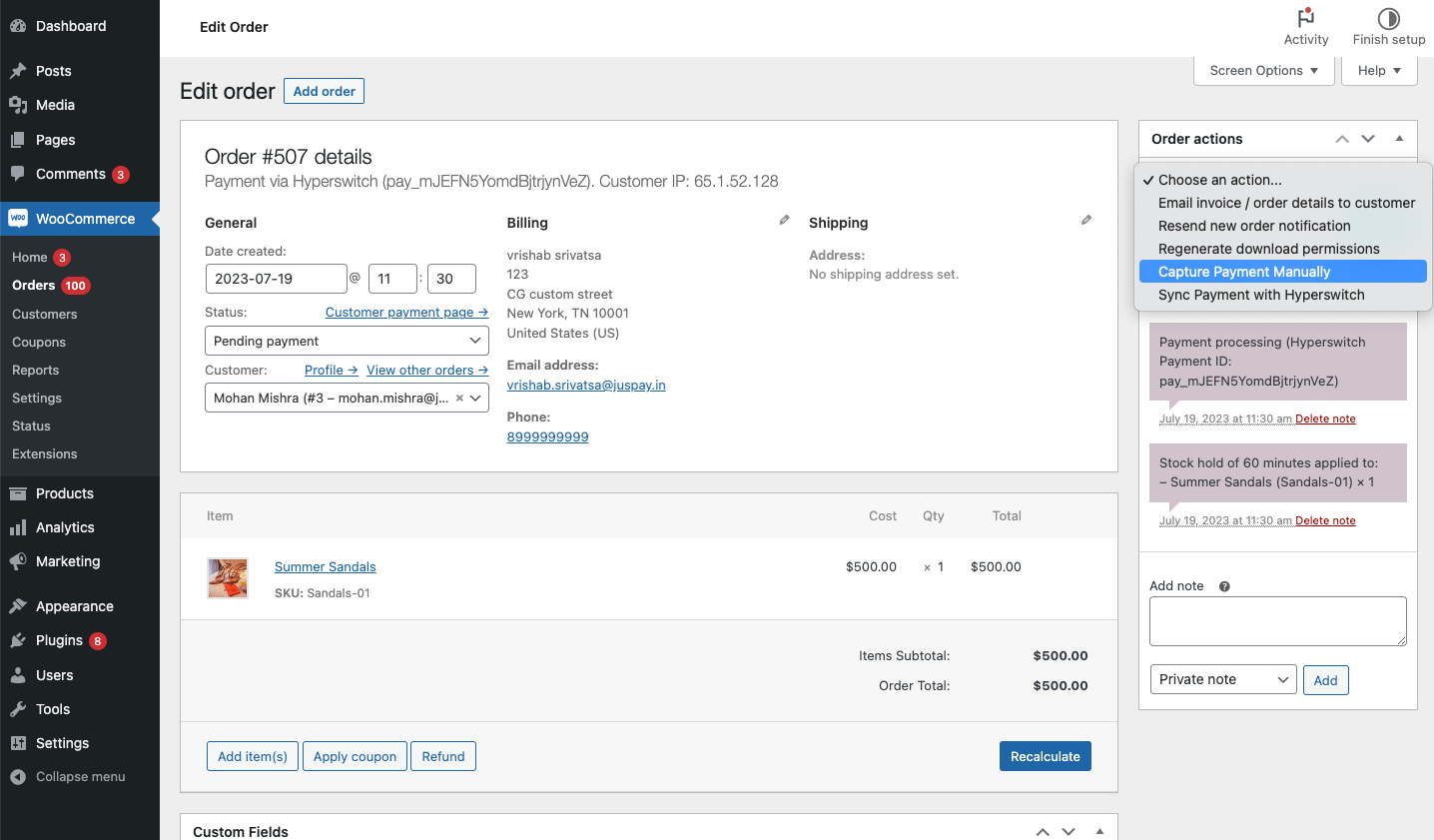 Once a customer authorizes their payment, you can easily capture payments manually through the Woocommerce Dashboard. Navigate to the Order Details page and click on the "Order Actions" dropdown. Select the "Capture Payment with Hyperswitch" option, and click on "Update".