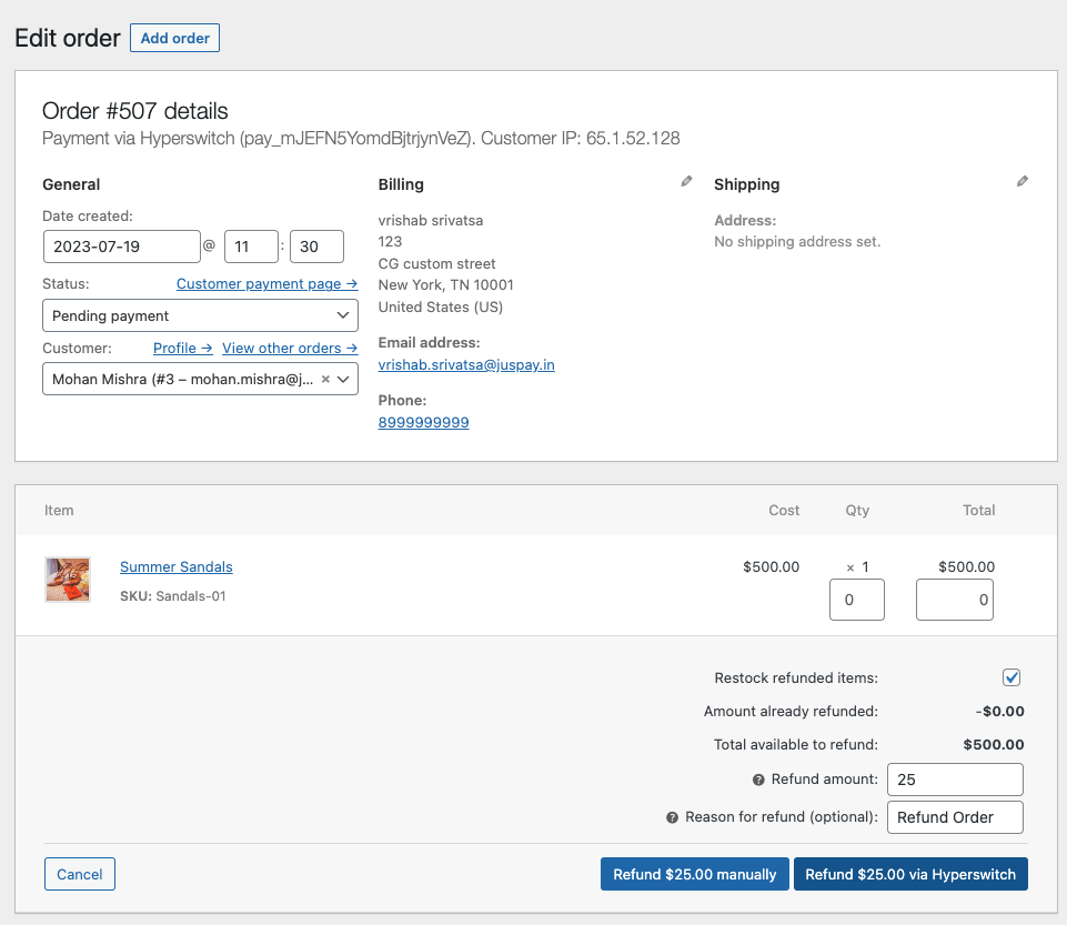 Note: Ensure you click on "Refund via Hyperswitch" and not the "Refund manually". Hyperswitch will handle the refund and update the payment status accordingly, ensuring a seamless refund experience for both you and your customers.