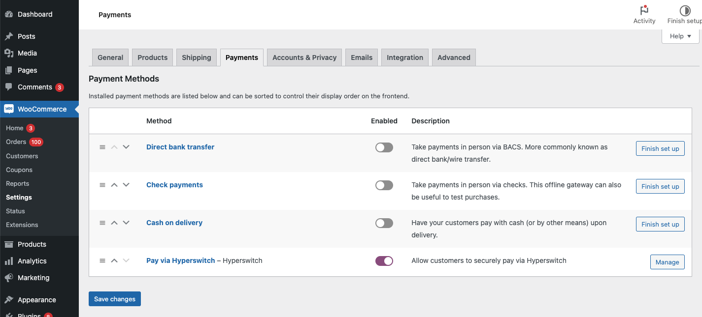 Navigate to Woocommerce > Settings section in the dashboard. Click on the "Payments" tab and you should be able to find Hyperswitch listed in the Payment Methods table.