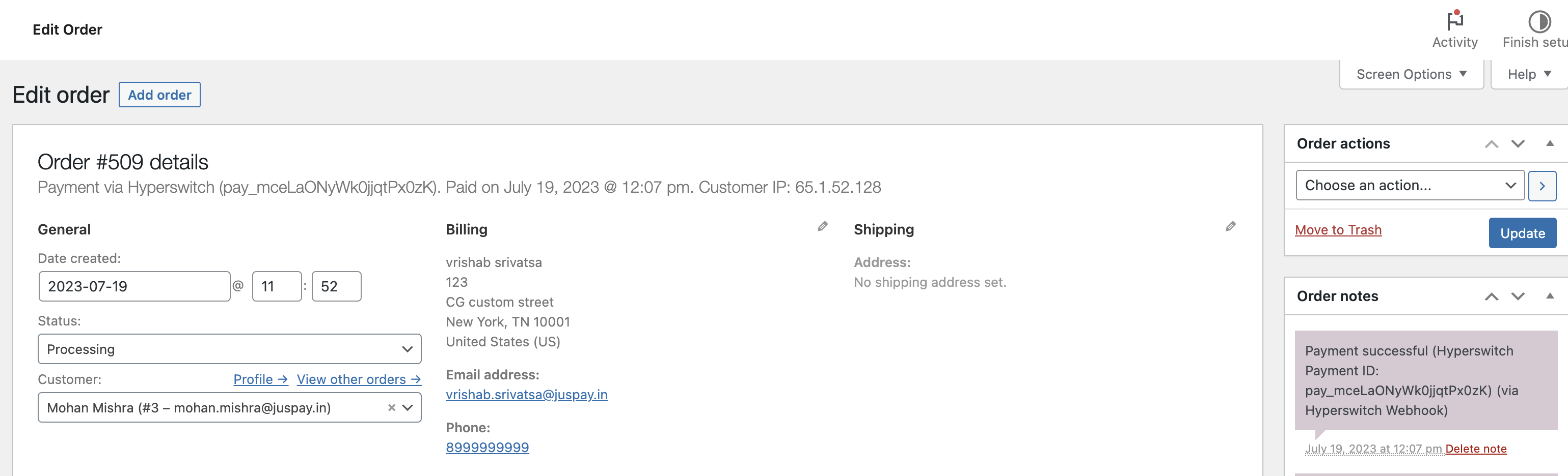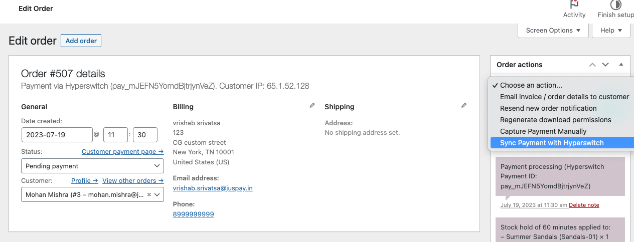 With the Hyperswitch plugin integrated into your Woocommerce Dashboard, you have the flexibility to manually sync payment status whenever necessary. This feature allows you to ensure accurate payment status representation and maintain consistent order management. Navigate to the Order Details page and click on the "Order Actions" dropdown. Select the "Sync Payment with Hyperswitch" option, and click on "Update".